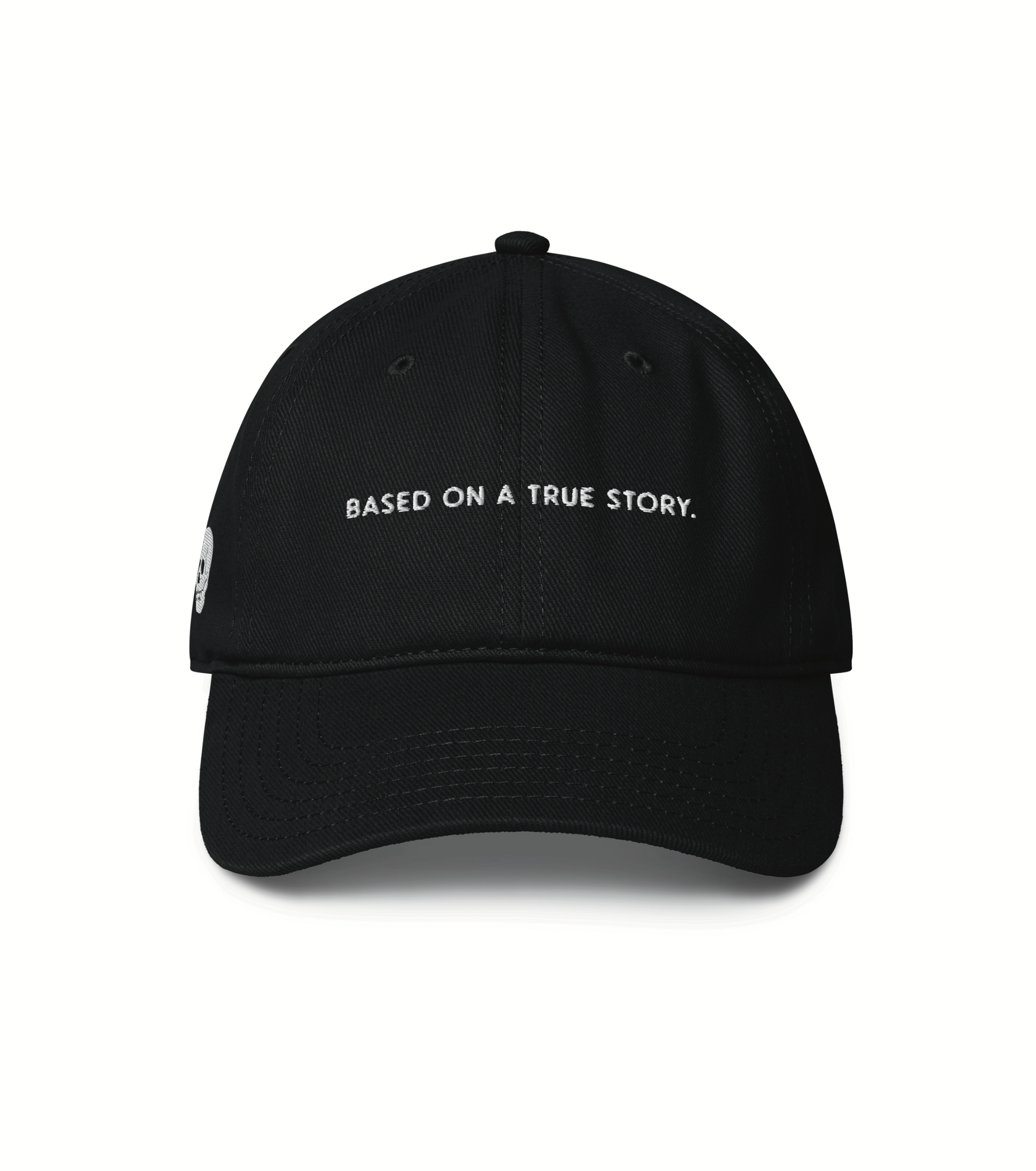 Whether you’re referencing old horror films or proudly living your own story, this one’s for you. Made from durable cotton twill with an embroidered skull on the side and “Based on a True Story” across the front. This unisex design is great for everyday wear, the gym of a night out.