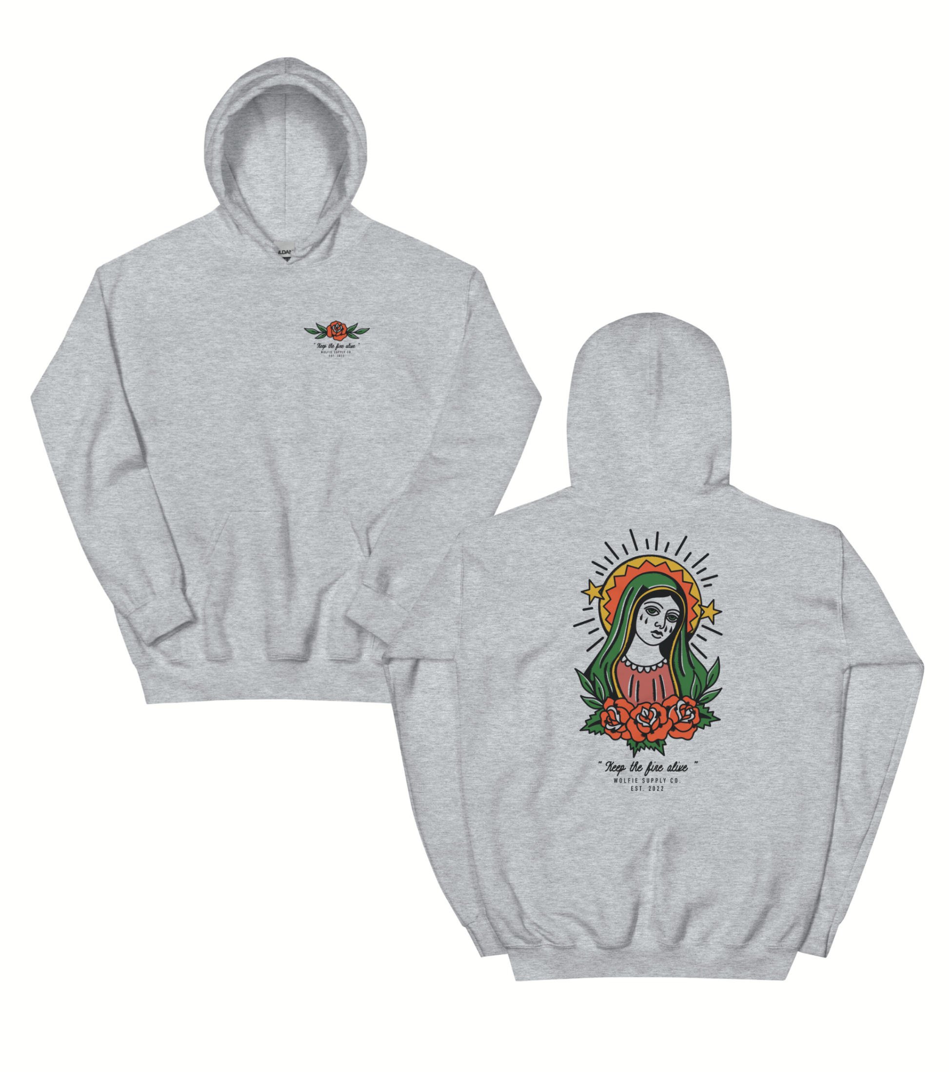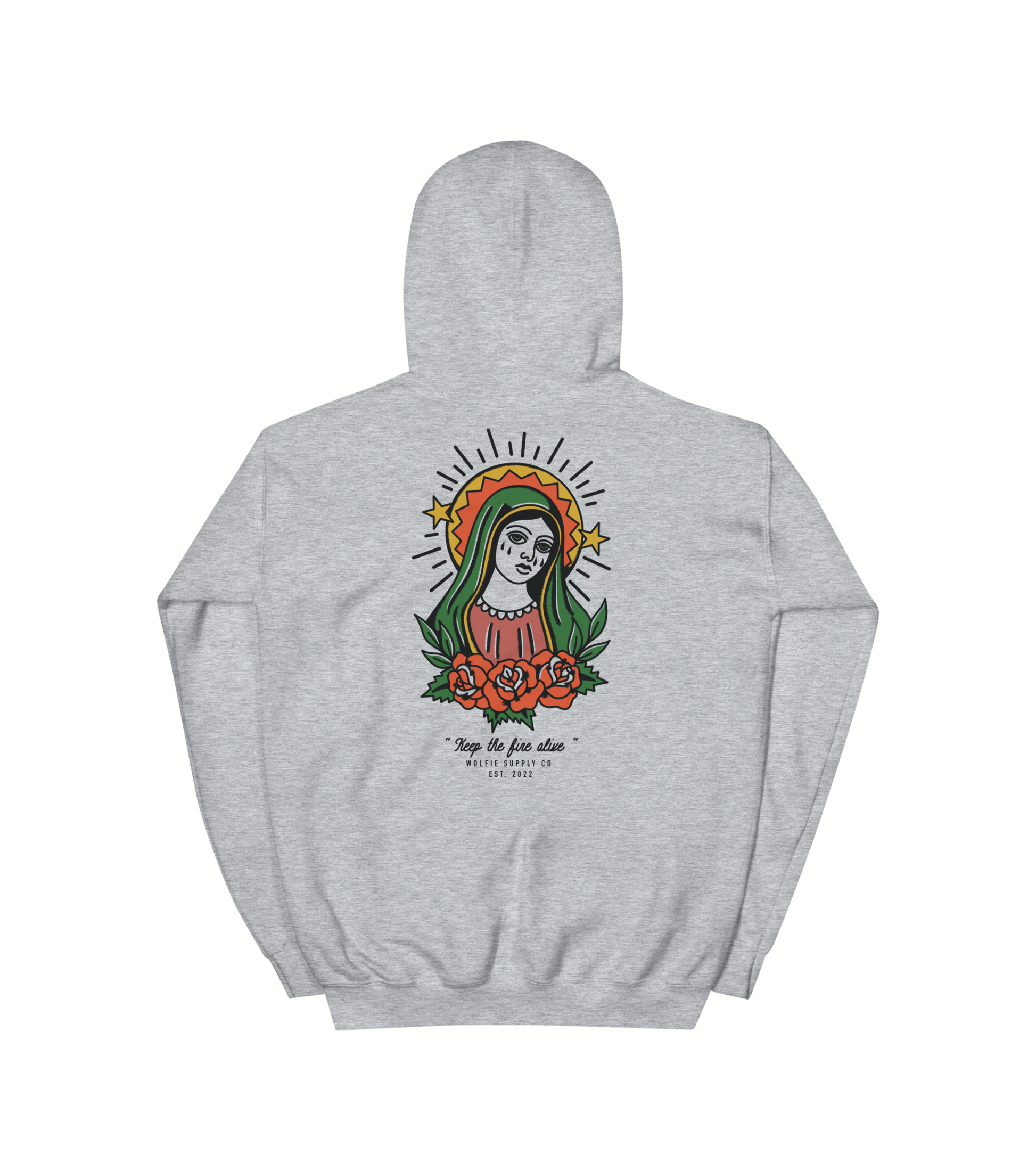 Wolfie keeping it traditional with the new Mary hoodie. Designed in a bold traditional tattoo style, this hoodie carries the spirit of resilience.